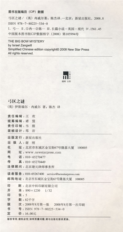 伊斯瑞尔·冉威尔(1864-1926),犹太裔英国人。当过教师、新闻记者、剧作家、幽默文学作家。一八九一年仅用两周时间创作的《弓区之谜》是历史上第一部长篇密室推理小说,为不可能犯罪类型的推理作品开创了新纪元。
