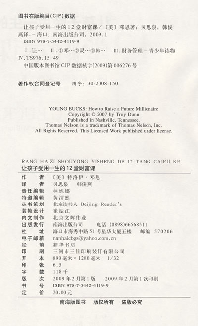推荐理由献给想让孩子更聪明、更富有、更幸福的父母!和孩子一起,实现财富梦想!为孩子开账户、上保险、买教育基金,把房子记在孩子的名下,都不如教他能受用一生的赚钱本领!本书为你的孩子准备了12堂财富课,告诉你如何做孩子成功的人生导师:发现孩子潜藏的商业天分,引导他们学习经商技巧,教会他们简单的财务知识;本书还特别结合孩子成长的不同阶段,提供了30种可实际操作的生意模板!