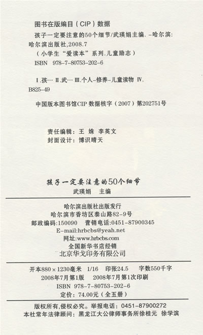 很多事情看起来都是小事,但是一旦积攒起来形成了不良习惯,就有可能给我们带来很大的伤害。以身作则,把握好每一个细节,就个人而言,能使我们更健康和顺利地成长,对集体来说,则能使我们凝聚更强大的力量;获得更大的成功。 细节决定成败,这句话应该牢记在心。本书就为小朋友讲述孩子一定要注意的50个细节。