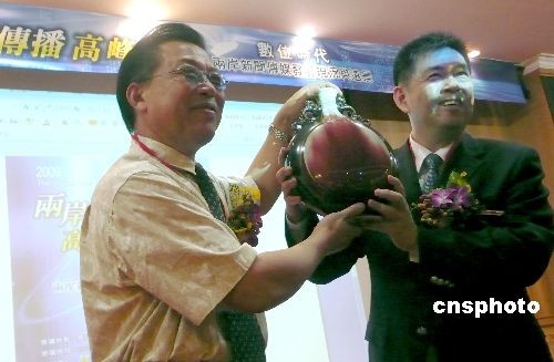 六月二十八日,中国文化大学中山学术研究所、大陆研究所在台北“国父纪念馆”中山讲堂举办“二00九两岸新闻传播高峰论坛”,一百多位传播学者与台湾媒体主管以“数字时代”为题探讨新闻传媒发展。图为上海大学影视学院副院长戴元光(左),向中国文化大学校长李天任(右)致赠纪念品。 中新社发 刘舒凌 摄
