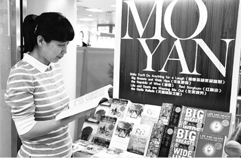 北京王府井书店日前引进了2012年诺贝尔文学奖得主中国当代著名作家莫言英文原版图书,将《生死疲劳》、《红高粱》、《丰乳肥臀》等六部莫言最具代表性作品的英文原版展现在读者面前。据了解,这些引进作品均由美国著名汉学家葛浩文进行翻译,在忠实于原著的同时,也为莫言作品增添了当代英美文学的色彩。图为读者正在展台前选购图书。(来源于江苏省新闻出版局)