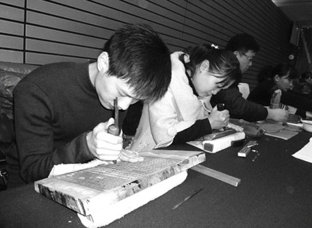 日前在扬州举办的2012中国扬州雕版印刷国际学术研讨会上,广陵古籍刻印社的部分职工在现场演示扬州雕版印刷制作工艺过程。该社社长朱世生介绍,该社多年来致力于雕版印刷技艺的传承与发展工作,为了加强对雕版印刷的行业管理,传承、传播雕版印刷技艺,保护传统工艺,自2009年起建立并实施了雕版印刷技艺标准化,目前该社建有雕版印刷技艺展示馆、雕版印刷技艺档案库、与相关部门合作研发的雕版印刷字库系统等。该社出版的《毛泽东点评二十四史》《邓小平文选》《北平笺谱》《扬州八怪笺谱》《金刚经》等上千种雕版印刷书籍深受市场欢迎。