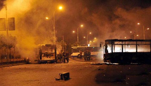 7月6日凌晨,在乌鲁木齐市大湾南路的跑马场地段,多辆公交车被烧毁,消防官兵赶到现场救援。