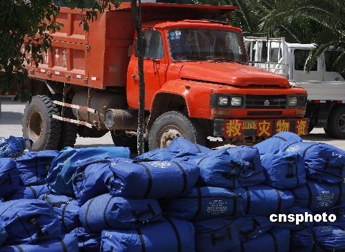 图为7月10日,一批救灾帐篷正准备运往灾区。 中新社发 刘冉阳 摄