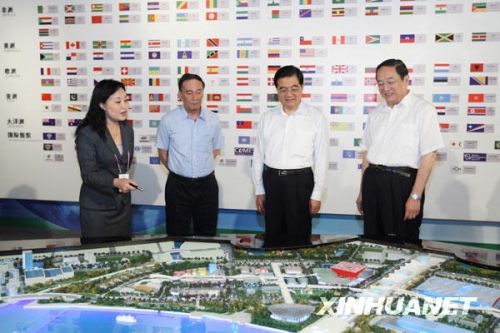 在上海世博会筹备工作概况展区,反映上海世博会空前规模的园区规划沙盘,引领观众漫游世博会园区的三维动画短片,张贴各参展方国旗和会旗的展示墙,反映全国人民支持参与筹办上海世博会情况的展板,表现富于创意的60个展馆的模型,展现被称为“东方之冠”的中国馆建筑细节的视频,吸引了胡锦涛等领导同志的目光,他们一次次停下脚步,看得十分专注,对上海世博会筹办工作取得的成绩给予充分肯定,对各参展方的热情参与表示高度赞赏。