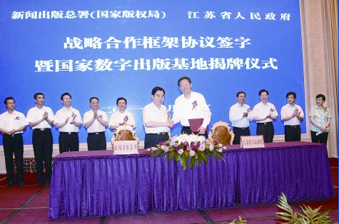 新闻出版总署和江苏省政府在南京签署《关于共同推进江苏新闻出版强省建设战略合作框架协议》。新闻出版总署署长、国家版权局局长柳斌杰,江苏省省长李学勇出席签约仪式,并代表合作双方在协议上签字,共同为江苏国家数字出版基地揭牌。 新闻出版总署副署长孙寿山宣读了总署同意江苏省建设国家数字出版基地的批复文件,并给基地南京雨花园区和无锡、苏州、扬州园区授牌。江苏省副省长曹卫星主持仪式。 柳斌杰在讲话中代表新闻出版总署,对署省战略合作框架协议的签署和江苏国家数字出版基地的揭牌表示祝贺。他说,新闻出版总署与江苏省政府在这里签署《关于共同推进江苏新闻出版强省建设战略合作框架协议》,并为江苏国家数字出版基地揭牌,这是双方开启全面合作、共同支持新闻出版业发展的一件大事,是贯彻落实党中央、国务院关于推进文化建设的一项有力举措。他指出,江苏省新闻出版业解放思想、深化改革,取得了事业繁荣和产业发展的显著成效,2010年全省新闻出版业总产出超过千亿元。江苏省新闻出版业是我国新闻出版业的重要支柱,也是我国新闻出版业发展最快的地区之一,潜力极大。他希望江苏省新闻出版业能够抓住难得的历史机遇,继续坚持正确的舆论导向和出版方向,加强传播能力建设;继续解放思想、深化改革,解放和发展文化生产力;继续调整结构、转变方式、坚持科学发展。要将此次签订的署省战略合作框架协议的各项内容落到实处,从而实现江苏省新闻出版业“十二五”的更好更快发展。要以此次国家数字出版基地正式揭牌为契机,积极创新体制机制、发展模式和管理方式,通过建设一批重大工程,实施一批重大项目,突破一批重大技术,开发一批重点产品,培育一批龙头企业,打造一批知名品牌,在实现资源合理配置、加快产业结构升级,促进产业协调发展方面作出积极贡献。他表示,总署将全力支持江苏省新闻出版业发挥优势、率先发展。 李学勇代表江苏省委、省政府对新闻出版总署长期以来给予江苏工作的关心支持表示衷心感谢。他说,这次署省签署战略合作协议和国家数字出版基地揭牌,充分体现了新闻出版总署对江苏的信任和厚爱,对于推动江苏数字出版工作再上新台阶、更好地发挥新闻出版业在建设文化强省中的主力军作用,具有重要而深远的意义。 下一步,江苏省委、省政府将大力推进包括新闻出版在内的文化建设,更加有力地推动江苏文化大发展大繁荣。江苏省新闻出版局要在新闻出版总署的指导和帮助下,切实加强工作衔接,确保战略合作框架协议各项任务落到实处。重点加快建设新闻出版公共服务、创新和现代出版产业三大体系,努力把江苏的科教人才优势、出版资源优势和市场潜力优势转化为新闻出版业的发展优势和竞争优势。同时,把加快数字出版基地建设作为推动新闻出版业快速发展的重要载体,落实基地建设规划,加大政策扶持力度,以富有特色、国内领先、国际一流为标准,把基地真正建设成为数字出版业发展高地。 根据此次签署的战略合作框架协议,新闻出版总署和江苏省政府将从构建新闻出版公共服务体系、提高苏版出版物核心竞争力、提升传统新闻出版产业、发展新兴新闻出版产业、整合新闻出版资源、实施版权兴业战略、推动新闻出版业“走出去”、加强人才队伍建设、建立合作工作机制等九个方面进行战略合作,共同推进江苏新闻出版强省建设。 此次揭牌的江苏国家数字出版基地,以南京为中心,设南京、苏州、无锡、扬州四个园区,以物业建设、平台搭建、政策扶持等为手段,整合内容、资本、技术、人才、信息等资源,搭建出版内容资源平台、内容数字化生产和传播技术平台、版权保护平台、数字阅读(听)电子商务平台等,重点打造数字图书、数字报刊、互联网出版、手机出版、数据库出版、按需出版和数字印刷、网络游戏动漫、数字音乐、数字教育、跨媒体复合出版等十大产业门类。力争通过3年~5年的努力,使基地具有数字出版技术业务综合服务功能、数字出版企业孵化功能、数字阅读公共服务功能、数字出版技术创新功能和数字版权保护和贸易功能等,至“十二五”末,总产出将超过千亿元。 仪式上,中国银行江苏省分行与南京日报报业集团签订了《南京市国家数字出版基地金融服务协议书》,南京市雨花经济开发区管委会与深圳宝德投资控股有限公司签订了国家数字出版基地“云计算研发”等合作协议,苏州阳澄湖数字文化创意投资有限公司与深圳市中视典数字科技有限公司、江苏连邦信息技术有限公司签订了合作协议。 当天下午,柳斌杰、孙寿山还在江苏省、南京市有关领导陪同下,考察了江苏国家数字出版基地南京雨花园区,分别听取了江苏省新闻出版局、南京市政府关于数字出版基地建设情况和雨花园区建设规划情况的汇报。 新闻出版总署办公厅主任刘建国、出版产业发展司司长范卫平、科技与数字出版司司长张毅君,江苏省政府秘书长樊金龙、副秘书长肖泉,江苏省新闻出版局局长徐毅英以及总署、江苏省有关方面负责人出席签约仪式。