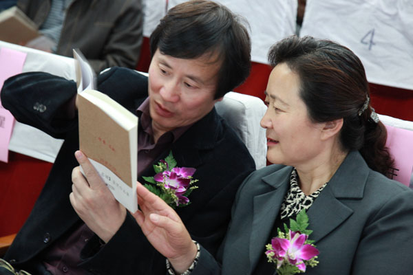 江苏省委宣传部·机关党委书记刘政先生和江苏省新闻出版局·综合处处长王建萍女士兴趣盎然地翻阅《诗意·名城获奖作品集》。